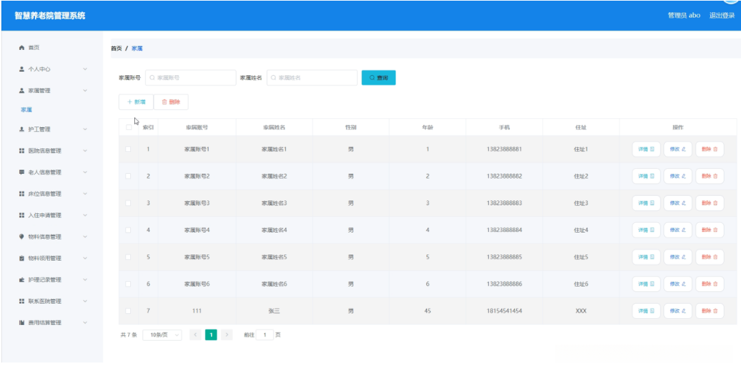 管理员点击家属管理。在家属页面输入家属账号、家属姓名进行查询、新增或删除家属列表,并根据需要对家属详情信息进行详情、修改或删除操作;如图5-3所示: