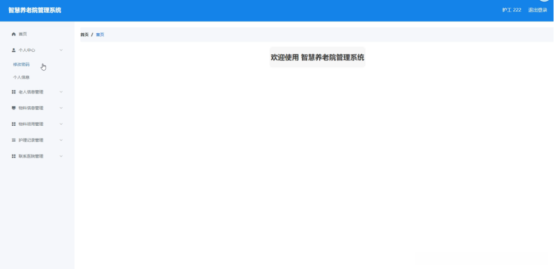 护工进入系统可以对个人中心、老人信息管理、物料信息管理、物料领用管理、护理记录管理、联系医院管理等功能进行操作。护工主页面如图5-13所示: