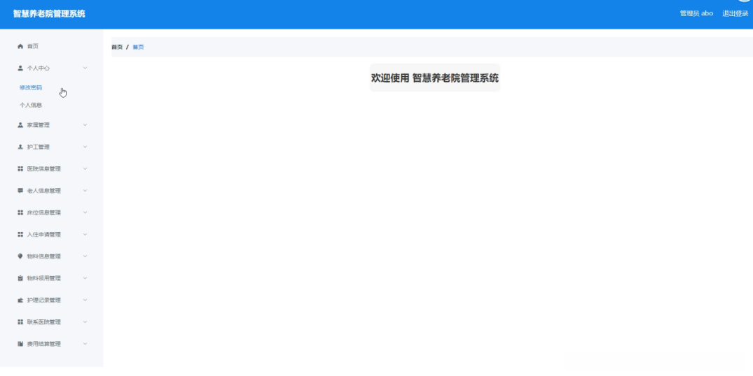 管理员进入主页面,主要功能包括对个人中心、家属管理、护工管理、医院信息管理、老人信息管理、床位信息管理、入住申请管理、物料信息管理、物料领用管理、护理记录管理、联系医院管理、费用结算管理等进行操作。管理员主页面如图5-2所示: