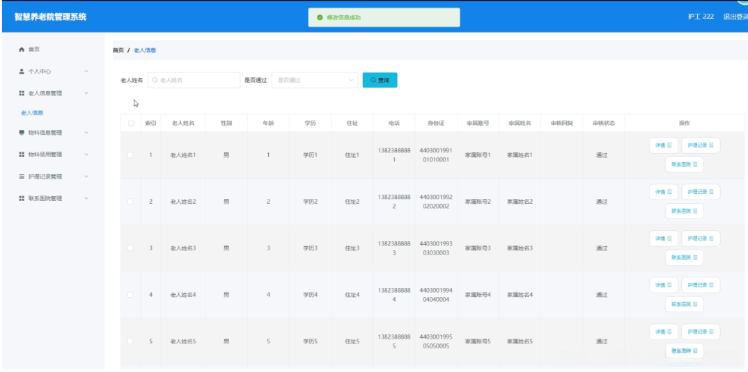 护工点击老人信息管理。在老人信息页面输入老人姓名、是否通过进行查询老人信息列表,并根据需要对老人详情信息进行详情、护理记录或联系医院操作;如图5-14所示: