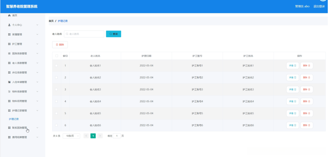 管理员点击护理记录管理。在护理记录页面输入老人姓名进行查询或删除护理记录列表,并根据需要对护理记录详情信息进行详情或删除操作;如图5-10所示: