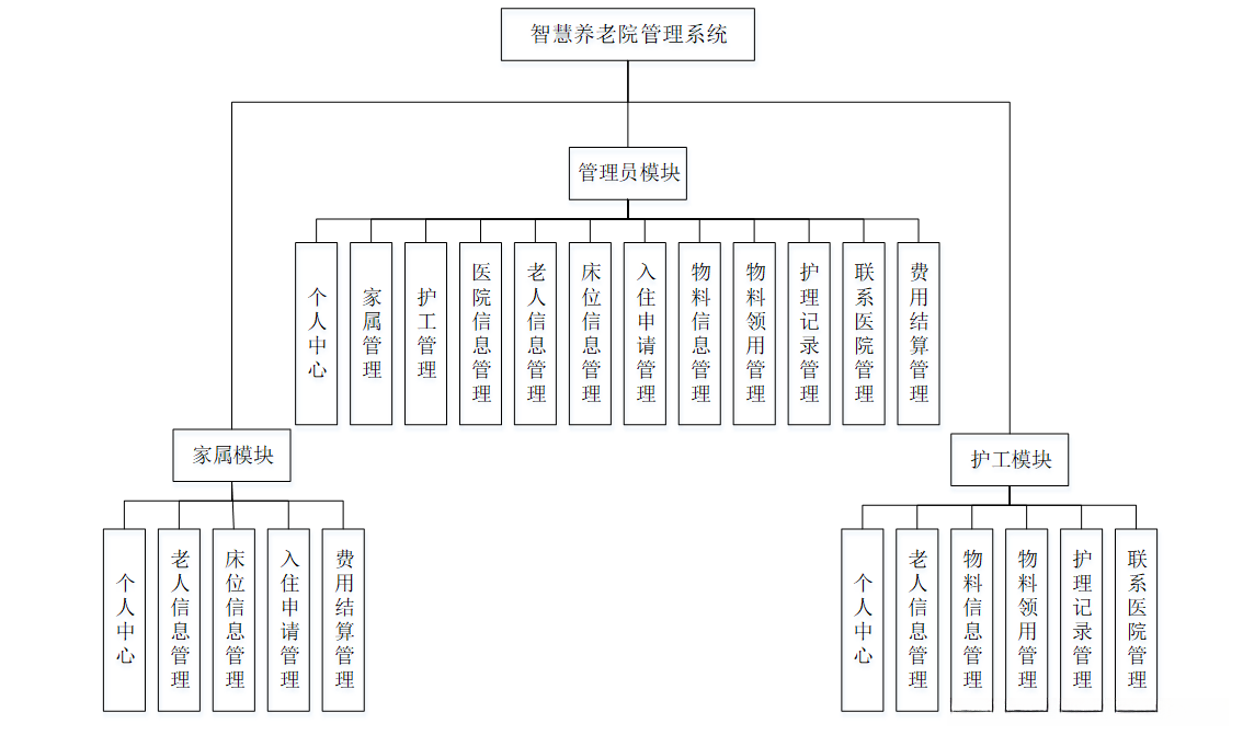 考虑到实际生活中在智慧养老院管理方面的需要以及对该系统认真的分析,将系统权限按管理员、家属和护工这三类涉及用户划分。