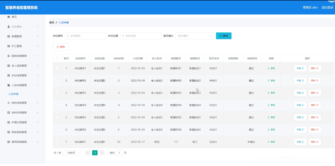 管理员点击入住申请管理。在入住申请页面输入床位编号、床位位置、是否通过进行查询或删除入住申请列表,并根据需要对入住申请详情信息进行详情或删除操作;如图5-7所示: