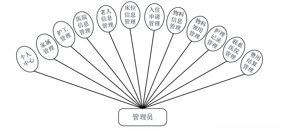 管理员登陆后,主要模块包括个人中心、家属管理、护工管理、医院信息管理、老人信息管理、床位信息管理、入住申请管理、物料信息管理、物料领用管理、护理记录管理、联系医院管理、费用结算管理等功能。管理员用例图如图3-1所示。