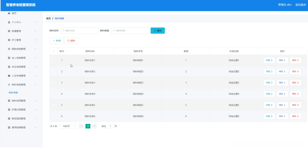 管理员点击物料信息管理。在物料信息页面输入物料名称、物料类型进行查询、新增或删除物料信息列表,并根据需要对物料详情信息进行详情、修改或删除操作;如图5-8所示: