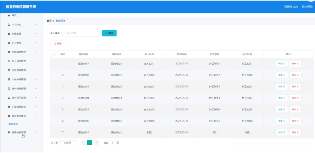 管理员点击联系医院管理。在联系医院页面输入老人姓名进行查询或删除联系医院列表,并根据需要对联系医院详情信息进行详情或删除操作;如图5-11所示: