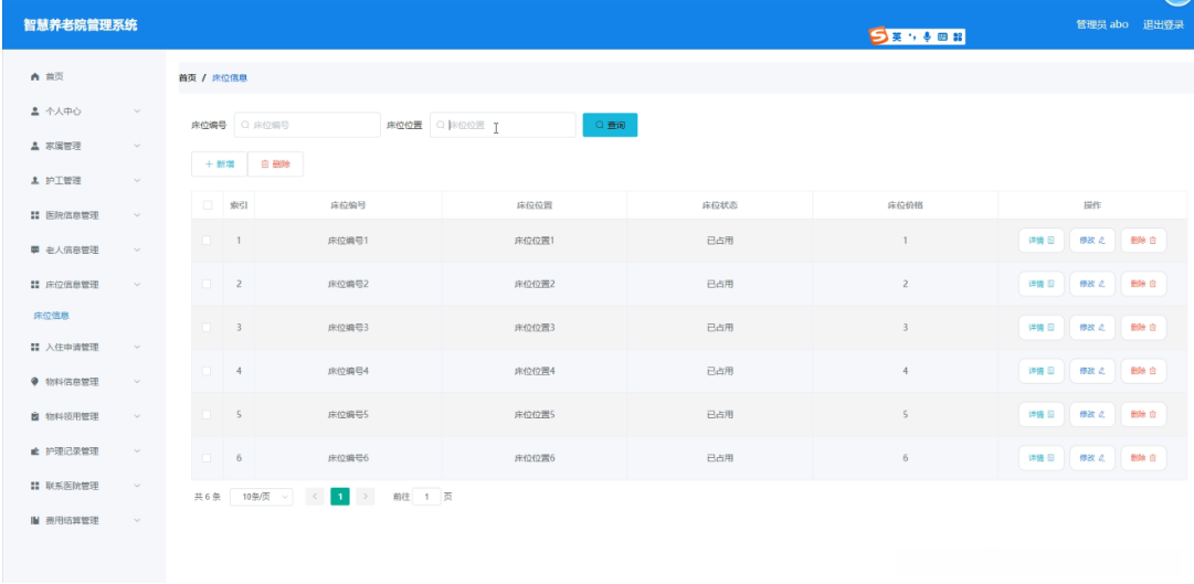 管理员点击床位信息管理。在床位信息页面输入床位编号、床位位置进行查询、新增或删除床位信息列表,并根据需要对床位详情信息进行详情、修改或删除操作;如图5-6所示:
