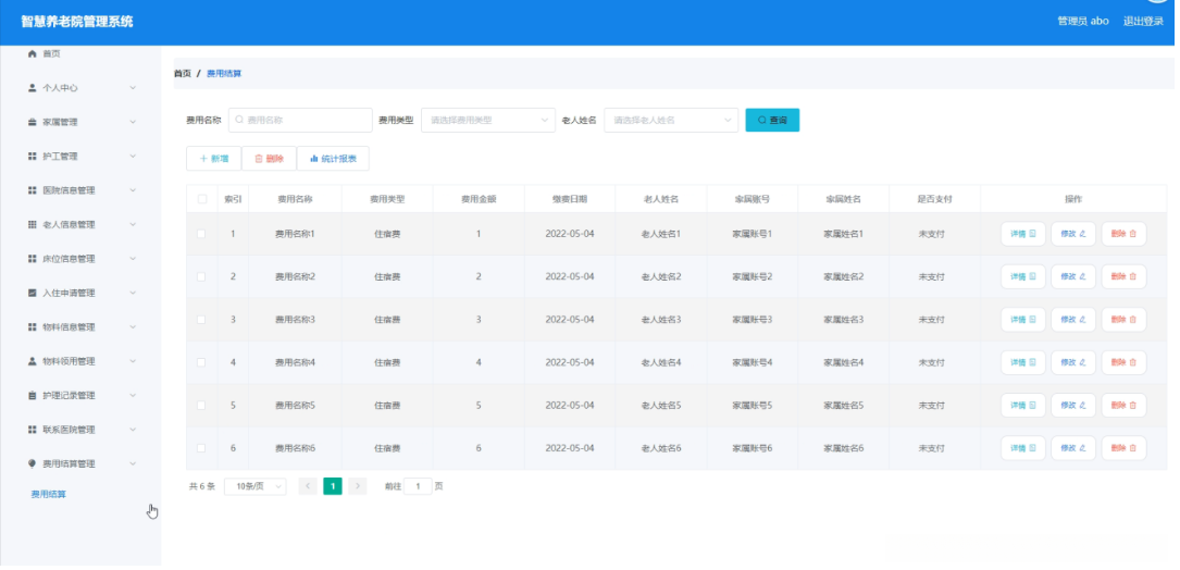 管理员点击费用结算管理。在费用结算页面输入费用名称和选择费用类型、选择老人姓名进行查询、统计报表、新增或删除费用结算列表,并根据需要对费用结算详情信息进行详情、修改或删除操作;如图5-12所示: