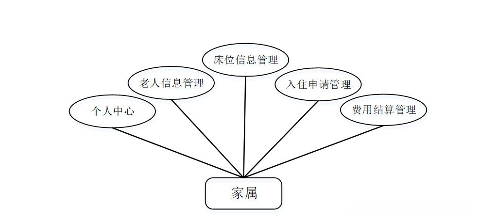 家属登陆后,主要模块包括个人中心、老人信息管理、床位信息管理、入住申请管理、费用结算管理等功能。家属用例图如图3-2所示。