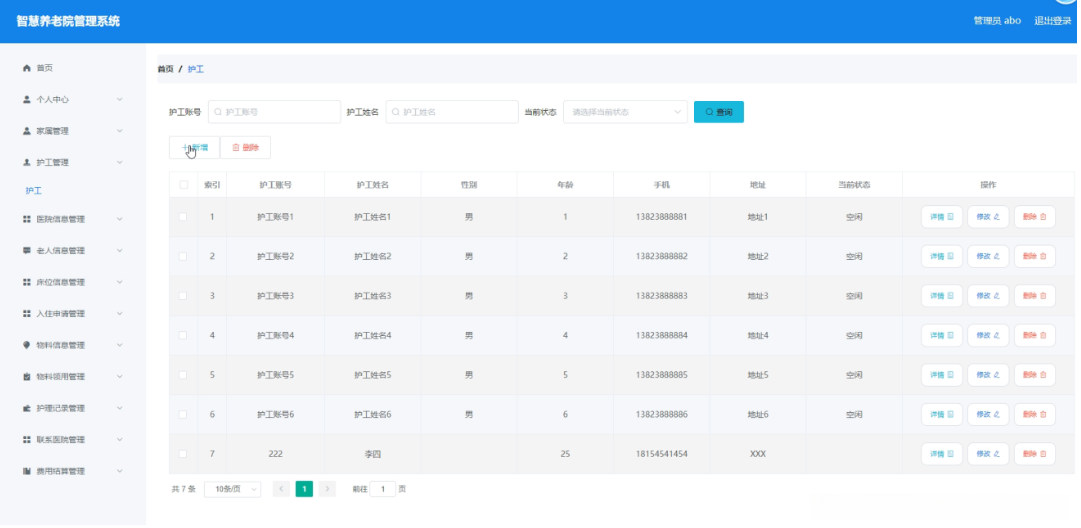 管理员点击护工管理。在护工页面输入护工账号、护工姓名和选择当前状态进行查询、新增或删除护工列表,并根据需要对护工详情信息进行详情、修改或删除操作;如图5-4所示: