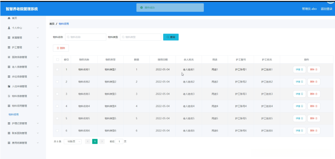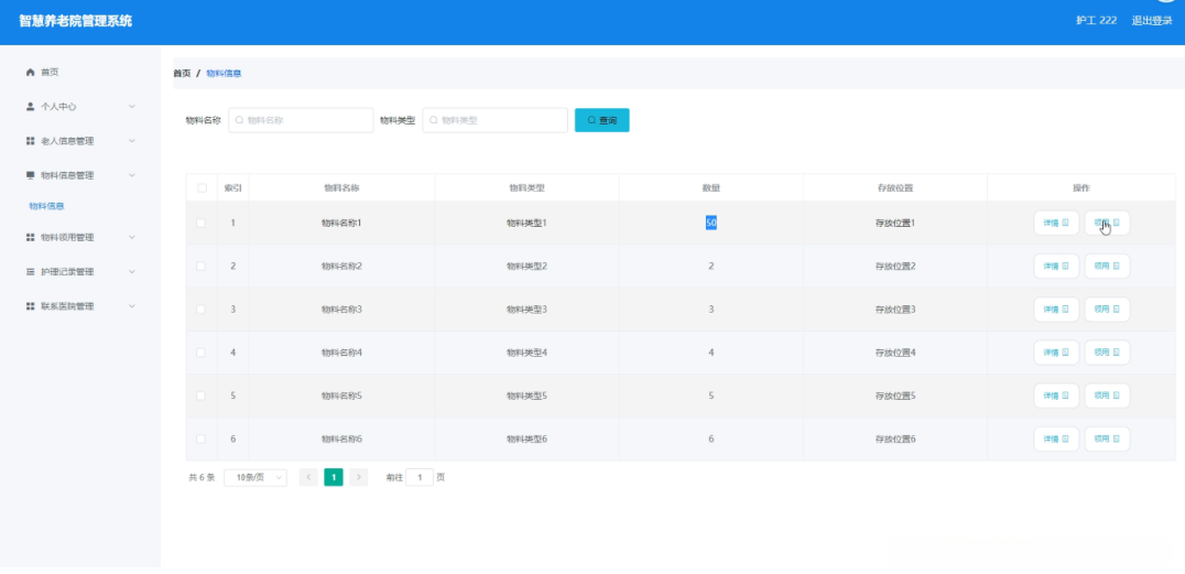 护工点击物料信息管理。在物料信息页面输入物料名称、物料类型进行查询物料信息列表,并根据需要对物料详情信息进行详情或领用操作;如图5-15所示: