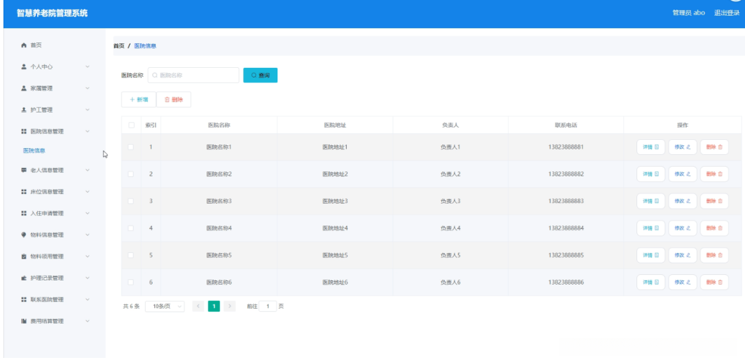管理员点击医院信息管理。在医院信息页面输入医院名称进行查询、新增或删除医院信息列表,并根据需要对医院详情信息进行详情、修改或删除操作;如图5-5所示: