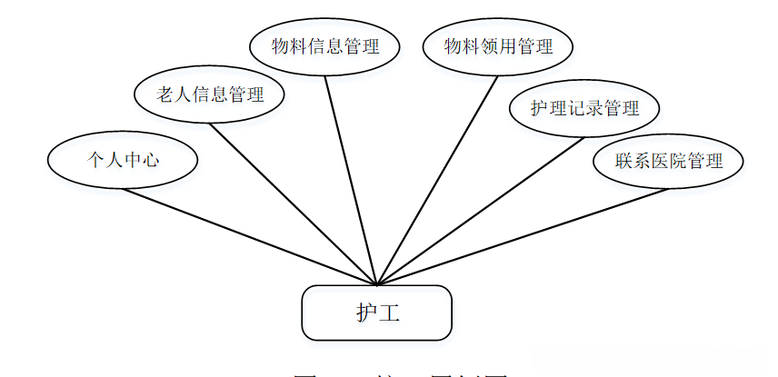 护工登陆后,主要模块包括个人中心、老人信息管理、物料信息管理、物料领用管理、护理记录管理、联系医院管理等功能。护工用例图如图3-3所示。