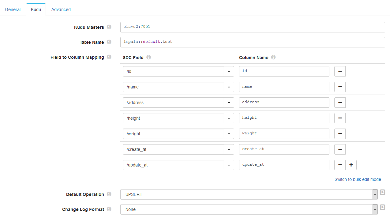这里需要对kudu集群进行参数配置, 包括指定主节点地址以及目标存储对象(即目标表格名称)。由于采用了impala架构来构建数据仓库, 因此在kudu集群中存储对应的元数据时需在表名前缀上添加impala::标识符。当mysql数据库中的字段与kudu集群中的元数据字段一一对应时, 则无需额外配置映射关系。