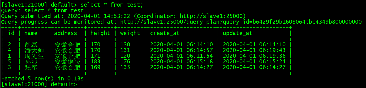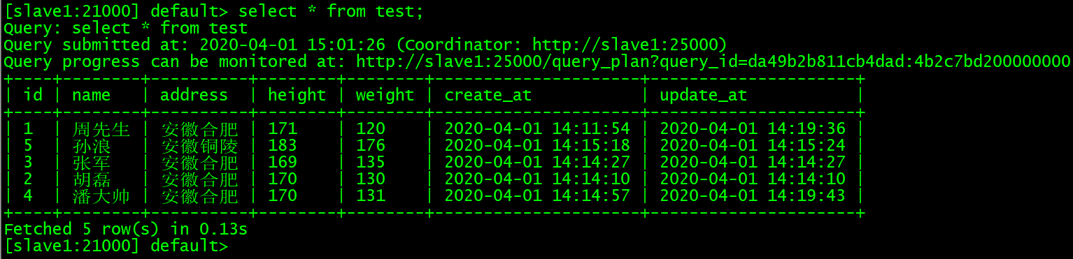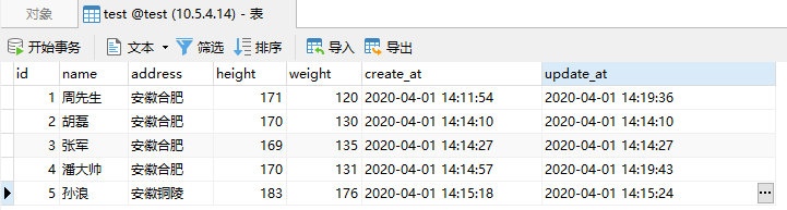 INSERT INTO `test` VALUES (1, '周先生', '安徽合肥', 171, 120, '2020-04-01 14:11:54', '2020-04-01 14:13:56');