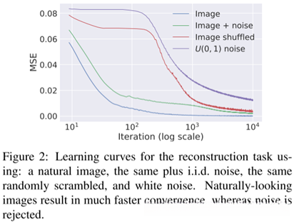 该研究者进行了一个实验,在其中将误差E明确设定为基于二范数的距离指标。该研究涵盖了四个不同的重建场景:包括自然图像、带噪声的自然图像、像素块打乱后的图像以及纯噪声图像。为了实现这一目标的研究者采用了随机初始化的网络模型,并基于数据项进行了相应的训练工作。在实际操作过程中研究人员持续跟踪并记录了每次迭代过程中的均方误差值。