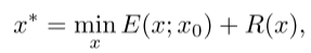 其中输出目标图像是x(记为x),在优化过程中被定义为目标需要处理的对象;原始输入图像为x_0;其中E是根据任务要求设定的数据保真性指标;而R(x)则代表先验知识项,在神经网络训练过程中通过引入标签信息Y进行建模训练。