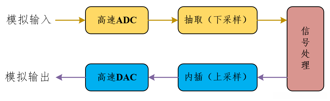 然而,在这种情况下(采样速率过高),对应的数据显示流速度也随之急剧上升。这使得后端信号处理环节面临巨大的压力并造成大量的硬件资源消耗。为此引入抽取滤波器便成为了解决这一矛盾的有效手段——它不仅能够降低数据传输速率还能缓解后端的压力。相反地讲 内插技术则是在降低数据传输速率的基础上通过内插操作来提升采样率从而确保高速DAC能够正常驱动。其中核心组件的主要框图如下所示: