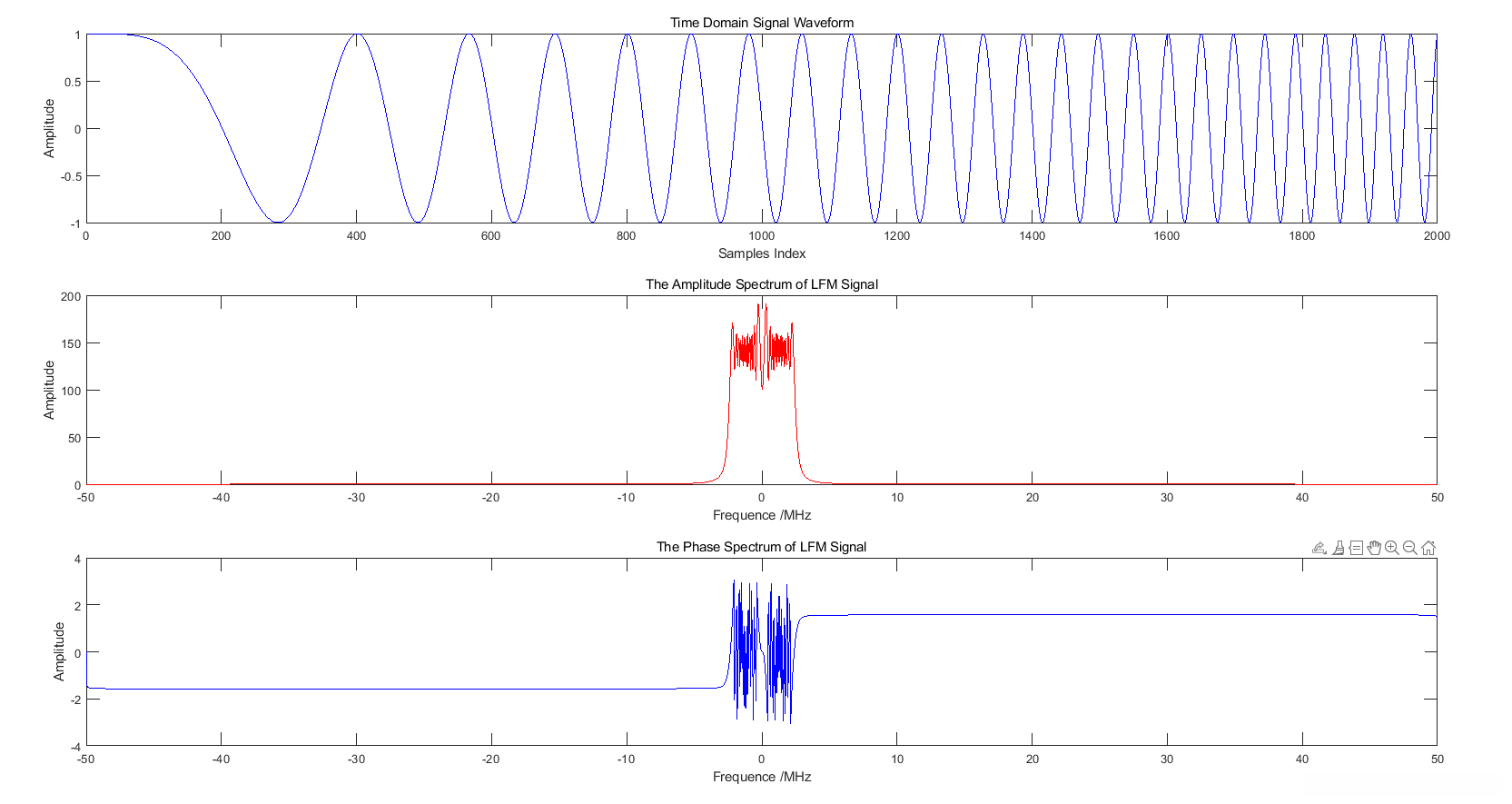 采用LFM信号作为研究对象进行分析。具体参数设置如下:将采样率设置为100MHz,并设定其带宽为2.5兆赫;抽样倍数取值为了10;同时确保原始序列的采样点总数设定为了2000个。