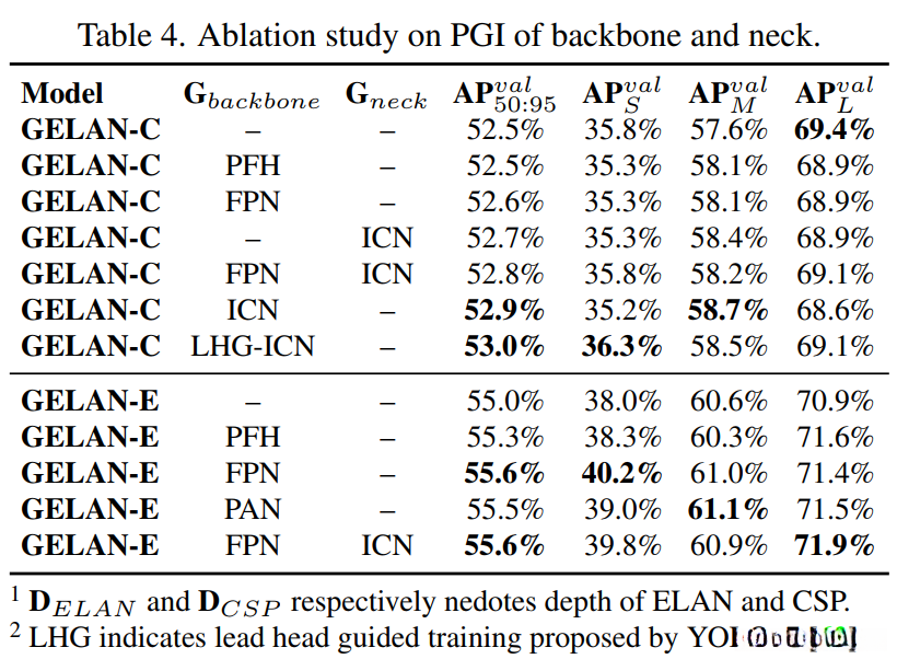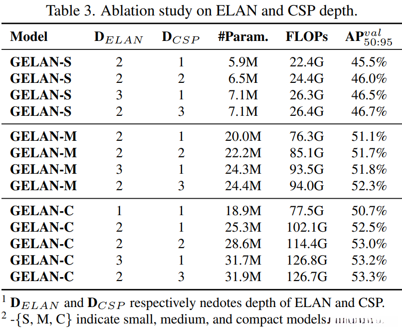 接下来,在不同规模的GELAN架构中展开了关于ELAN块深度与CSP块深度的研究实验,并将研究结果列于表3所示表格中。通过观察发现,在将ELAN的结构由1层提升至2层时能够明显提高模型性能;然而当其深度达到2层及以上时(不论是增大ELAN结构还是CSP结构),系统参数数量、计算开销以及输出精度都将呈现线性增长的趋势。这一研究结果表明GELAN架构对于网络深度具有良好的适应性特点;换句话说,在设计复杂的网络架构时用户无需进行特殊化设计即可获得稳定性能表现的结果;具体而言,在表3中的YOLOv9-{S,M,C}配置下我们设置了各层次组合的具体参数设置为{{2, 3}, {2, 1}, {2, 1}}。