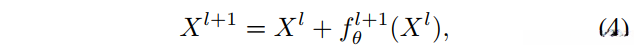 其中l标识PreAct ResNet的第l层,并以转换函数f进行处理。该网络通过显式设计将输入数据X在各层之间循环传递。尽管这种设计能够使深度神经网络在数百甚至上千层时仍能良好收敛。然而这却成为了一个关键问题阻碍深层神经网络发展的原因之一。此外这一现象也说明了为何较浅层结构往往难以超越更深架构如ResNet[21]的表现。
