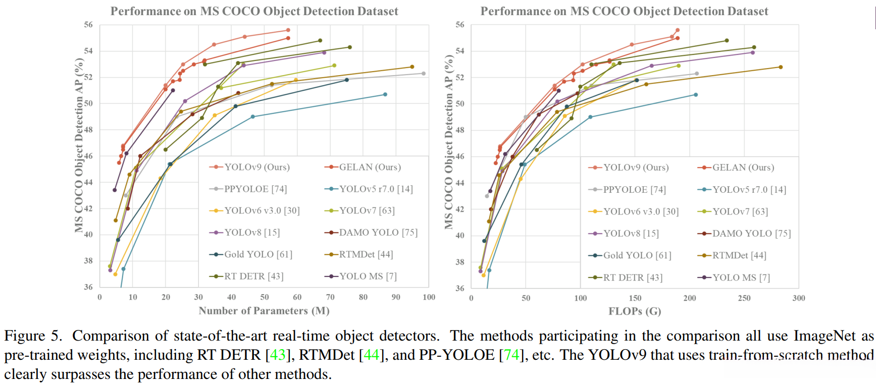 同时, 我们还在与ImageNet预训练模型的对比中纳入了评估, 具体结果可见于图5. 在这一领域占据领先地位的是RoBERTa-Base [43]. 需要指出的是, 在参数效率方面,默认卷积架构在YOLOv9中的表现超越了深度可分离卷积设计在YOLO MS中的应用. 进一步研究表明, 在经过ImageNet预训练后的RoBERTa-Base [43]同样表现出色. 更值得强调的是, 在深层架构设计中,默认卷积方案展现了显著的优势.