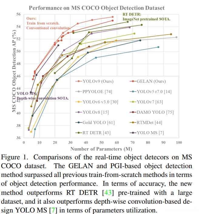 融合了PGI与GELAN技术后,YOLOv9在MS COCO目标检测基准上的性能表现显著超越了现有技术中的实时目标检测算法。