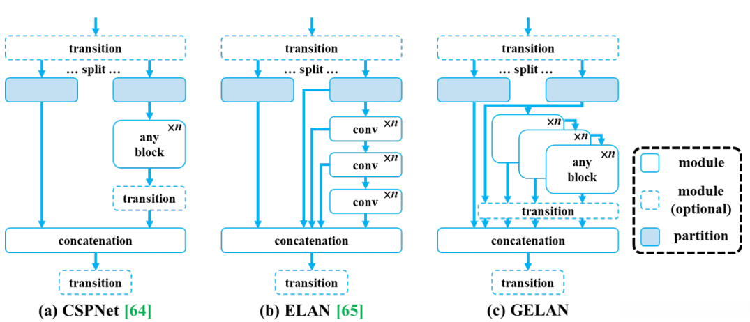 Figure 4 illustrates the architecture of GELAN, which comprises three components: (a) CSPNet [64], (b) ELAN [65], and (c) our proposed GELAN. By borrowing the structure from CSPNet, we build upon ELAN to create GELAN that supports a variety of computational modules.