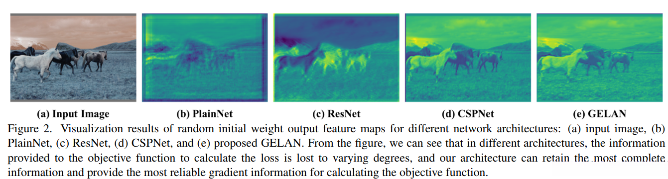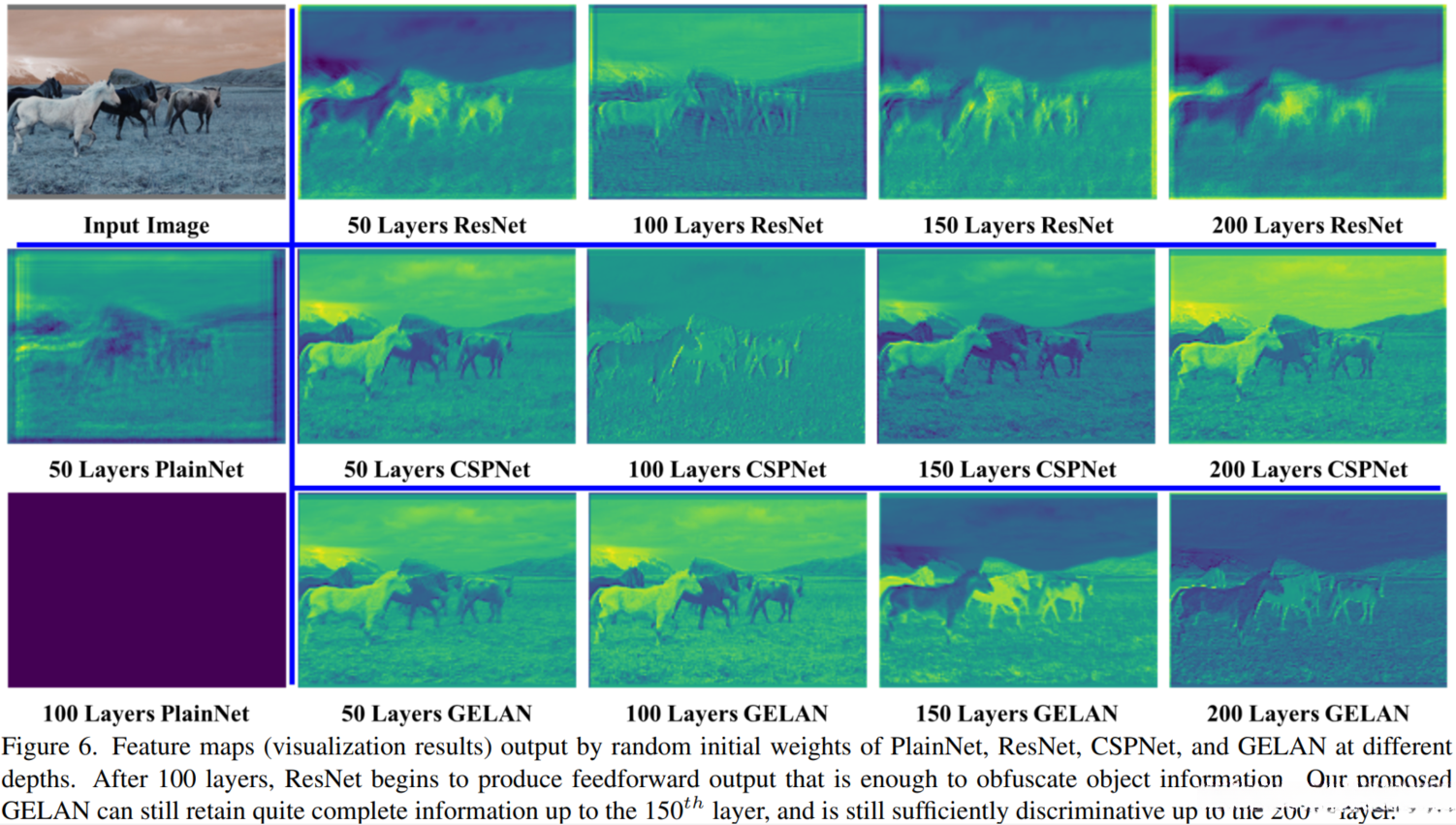 本节将深入分析信息瓶颈问题,并通过可视化手段展示关键发现。同时, 本节还将重点展示如何利用可靠梯度来揭示数据与目标之间的关联机制, 并对比现有方法的优势与不足。通过可视化结果可以看出, 在不同架构中使用随机初始权重时各层的特征图呈现出显著差异: 在浅层网络中, 特征图包含较多低频信息; 而深层网络则表现出较强的高频特性, 这一现象在各实验条件下均成立且具有统计学意义。研究发现, 当模型深度逐渐增加时, 在各层中被保留的信息量显著下降: 对于传统的全连接网络(PlainNet), 到第50层时仍能清晰辨识物体的位置特征, 但到了第100层则完全丢失了可区分度较高的对象特征; 而ResNet虽然在第50层仍能清晰辨识物体的位置特征, 但其边界信息已经变得模糊不清; 相比之下,CSPNet 和我们提出的方法GELAN则展现出良好的性能: 它们能够在相对深层(如200层)依然保持足够的判别能力以实现准确分类; 同时,GELAN方法表现出更强的稳定性: 其生成的结果不仅判别能力更强, 边界信息的表现也更为清晰且稳定