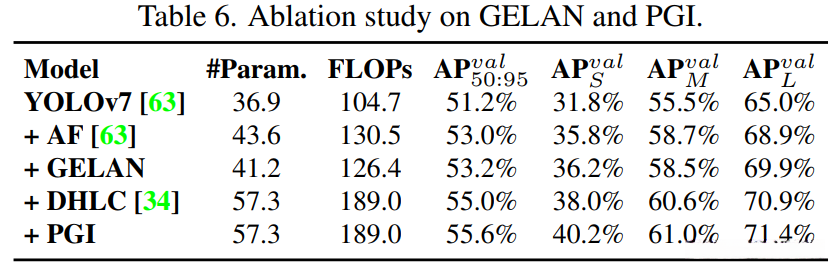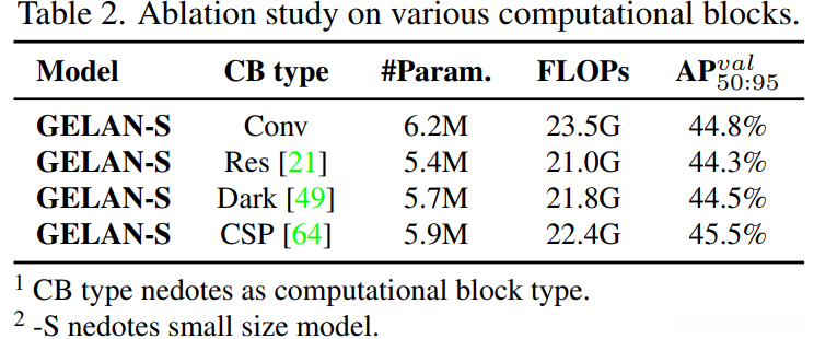 我们在开发GELAN的过程中首先展开了消融实验。针对不同类型的计算模块(包括ResBlock [21]、DarkBlock [49]以及CSPBlock [64])进行了系列测试。经过测试发现,在多种替代方案中采用CSPBlock(即深度可分离卷积模块)表现出色。通过将ELAN中的卷积层替换成不同类型的模块(如ResBlock [21], DarkBlock [49], 和CSPBlock [64]),系统的性能始终保持在较高水平。开发者能够灵活地更换各种类型的模块,并在各自适用的推理设备上实现应用。经过测试发现,在多种替代方案中采用CSPBlock(即深度可分离卷积模块)表现出色,并且这种模块不仅显著降低了模型的参数数量和运算开销,并且还提升了整体精度水平。因此我们决定将基于CSP-ELAN的设计方案作为YOLOv9中GELAN组件的核心模块