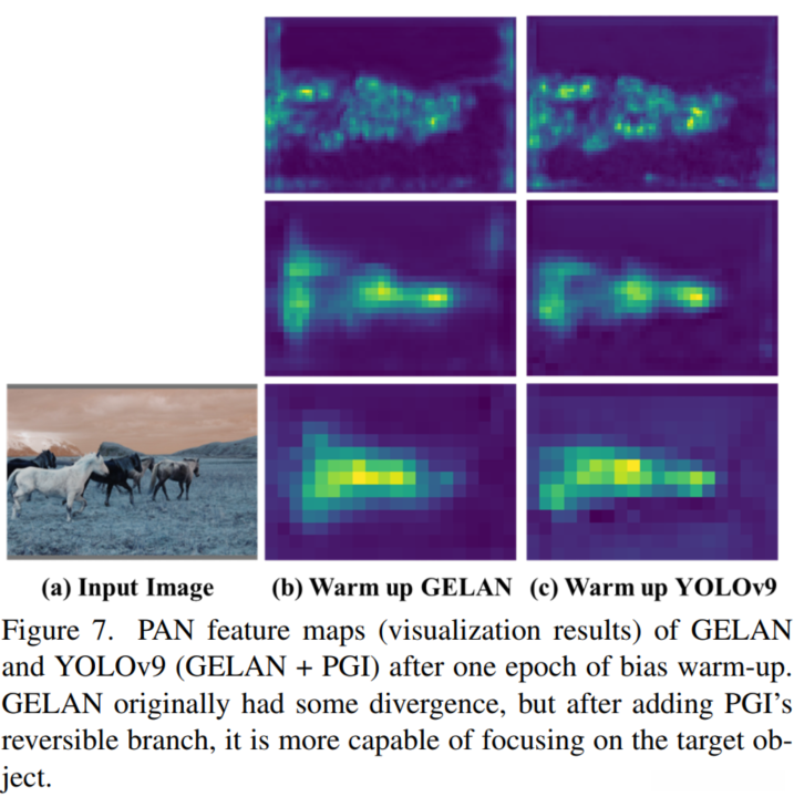 图7用于分析PGI在训练过程中的表现是否能提供更可靠的梯度,在这种情况下参数更新能更好地反映输入数据与目标之间的联系。图7展示了GELAN模型以及加入PGI后的YOLOv9(GELAN + PGI)在PAN偏置预热任务中的特征图可视化结果。通过对比图7(b)和(c),我们可以清晰地看到PGI能够准确且简洁地捕获包含对象的区域特征。而未采用PGI的GELAN则表现出在检测边界时出现发散现象,并在某些背景区域产生了非预期的响应效果。这些实验结果表明,在参数更新阶段使用PGI不仅提升了梯度质量,并且使得主分支前馈层能够保留更多关键特征信息