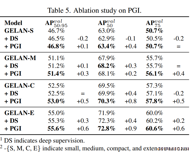 进一步研究了PGI与深度监督概念在不同规模模型中的应用,并进行了对比分析。如同最初所讨论的那样,在引入深度监督后会导致浅层模型精度下降这一现象依然存在。值得注意的是,在通用模型中引入深度监督会带来性能不稳定的问题;而根据设计理念,在极深的网络架构中才能充分发挥其优势。本文提出的方法——PGI——通过有效缓解信息瓶颈以及信息断裂问题,在多个规模模型上均实现了精度提升的目标;这一创新性概念不仅提供了两项重要贡献:其一在于扩展了辅助监督方法的应用范围至浅层神经网络;其二则在于为深层网络训练过程提供了更为可靠的梯度支持;这些梯度使得深层网络能够更加准确地建立数据与目标之间的关联关系