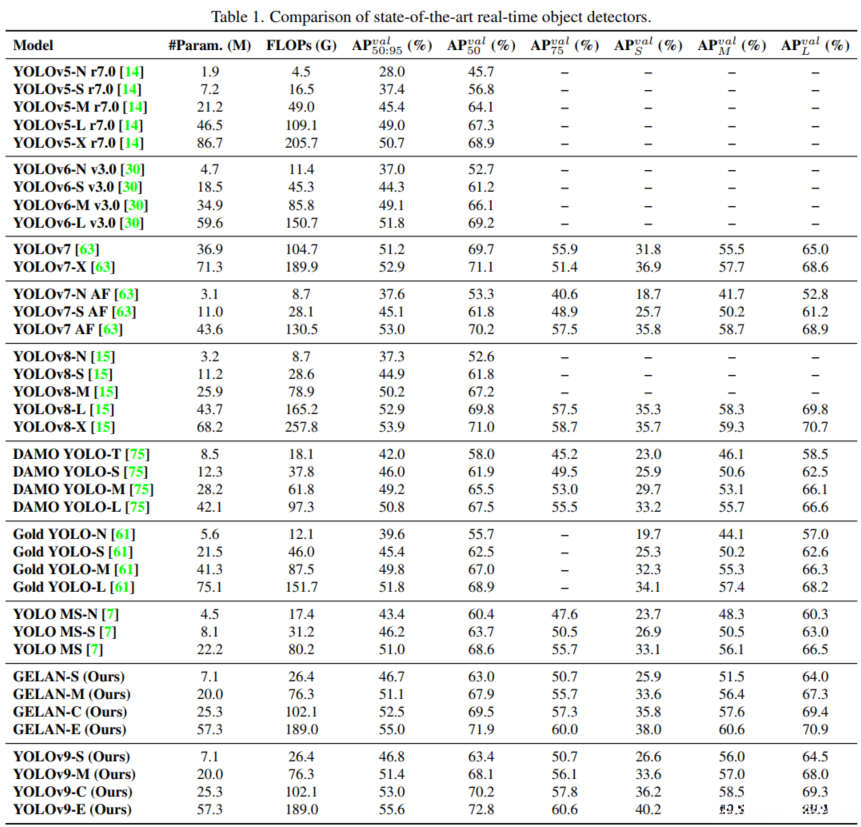 在本文中,我们提出采用PGI技术针对信息瓶颈问题以及针对轻量级神经网络的深度监督机制不适用性进行解决方案的设计。经过我们的研究开发出一种高效率且低计算复杂度的神经网络架构GELAN。该模型能够适应多种推理设备的需求并展现出卓越的目标检测性能,在不同计算层次均能稳定可靠地运行。通过引入PGI技术处理策略,在精度上均取得了明显提升。具体而言结合GELAN架构优化使对比于YOLOv8,在参数规模缩减49%、计算开销降低43%的同时,在MS COCO数据集上的平均精度(AP)提升了0.6%。