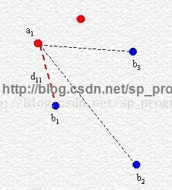 其中a和b分别是点集A和B中的点,d(a,b)表示点a和点b之间的几何距离,那么用穷举法就可以计算这两个点集的Hausdorff距离,如下图所示: