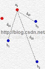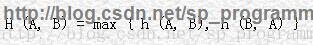 必须注意的是Hausdorff距离是定向的,也就是说多数情况下h(A,B)并不等于h(B,A),如上图所示,h(A,B)=h(a1,b1),而h(B,A)=h(b2,a1),这个不对称性是极大极小函数的一个特性,那么Hausdorff距离的一个更加通用的定义是