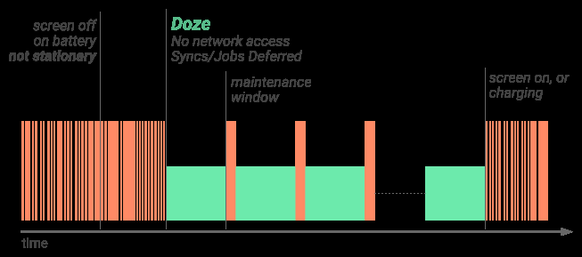 Android 6.0 推出了低电耗模式,即设备处于空闲状态时,通过推迟应用的 CPU 和网络活动以实现省电目的的系统模式,例如,设备放在桌上或抽屉里时。