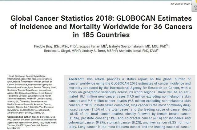 美国癌症学会官方期刊发布《2018全球癌症统计报告》,对包括36种不同类型的癌症在内的185个国家进行了发病率与死亡率的统计分析。研究显示,在全球范围内,中国的肿瘤发生率及死亡率均位居榜首。