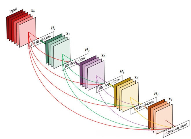 DenseNet 是一种基于密集连接设计的卷积神经网络结构,在其架构中任何相邻两层之间都存在直接连接关系。具体而言,在这样的网络体系中,默认情况下每一层都会接收并集处理来自前面所有 preceding layer 的输出信息,并将这些整合后的特征作为当前 layer 进行学习的基础数据来源;同时,在完成特定任务的学习后所生成的关键特征图也会被系统性地传递给后续各 layer 以支持进一步的信息处理与感知功能。