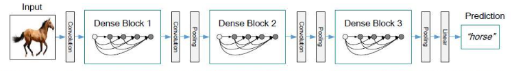 DenseNet是一种基于密集连接设计的卷积神经网络模型,在其架构中任何相邻两层之间都存在直接连接关系。具体而言,在这种设计中每一层都会将所有前一层输出的信息作为输入进行融合,并将所学习到的特征图传递给后续所有层进行处理。如图所示的是DenseNet中的一个典型 dense block结构示意图,请注意每个 dense block内部的构造遵循以下模式:经过BN-ReLU激活后先执行1×1卷积提取特征信息,并随后通过BN-ReLU激活加上3×3卷积完成空间信息的学习与提取。值得注意的是每个 dense block之间的过渡部分采用BN-ReLU-Conv(1×1)-averagePooling(2×2)模块实现跨块信息的有效传递。
