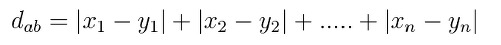 (2) n维空间上两点a(x1,x2……..xn),b(y1,y2……..yn)的曼哈顿距离公式: