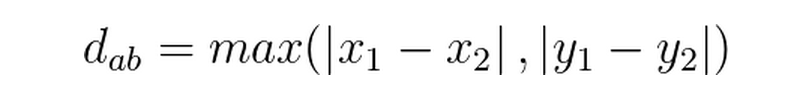 (1)二维平面上两点a(x1,y1),b(x2,y2)之间的切比雪夫距离公式: