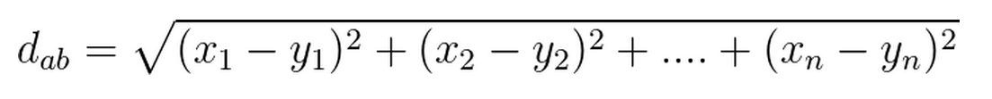 (2) n维空间上两点a(x1,x2……..xn),b(y1,y2……..yn)的欧式距离公式: