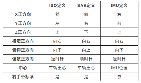 在车辆动力学领域中,ISO所设定的车体坐标系是一种常见的选择。另一方面,在航空航天领域常用的机舱坐标系统则与SAE所设定的车体坐标准备方案保持一致。此外,在基于IMU建立的车体坐标系统下,在涉及IMU的应用场景中也得到了广泛应用。无论如何选择坐标准备方案,在正确应用的情况下都可以实现对车身姿态信息的有效描述,并准确地确定周围物体及自身相对于对方的位置关系。开发人员应根据具体应用场景的需求以及个人偏好来决定采用何种坐标准备方案