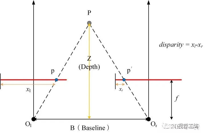 三角测距技术:基于视差原理利用两台相机之间的相对位置关系(具体指两台相机中心之间的直线距离),可实现各匹配点空间位置信息的确定。其中深度d的计算公式可简化为:d = \frac{b \cdot f}{x}。这里b表示基线距离、f表示相机焦距、x则代表视差值。