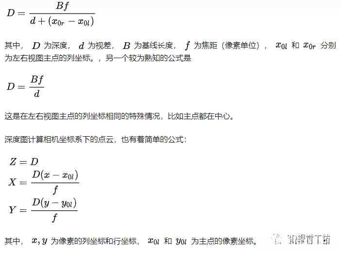 确定三维空间中的坐标位置:当获得深度数据时(d=z),可以通过相机的内部参数(如镜头焦距及中心点位置)和外部参数(如相机的位置与朝向)来推导出各匹配点在三维空间中的坐标值。这一过程通常需要求解一个线性方程组的过程。
