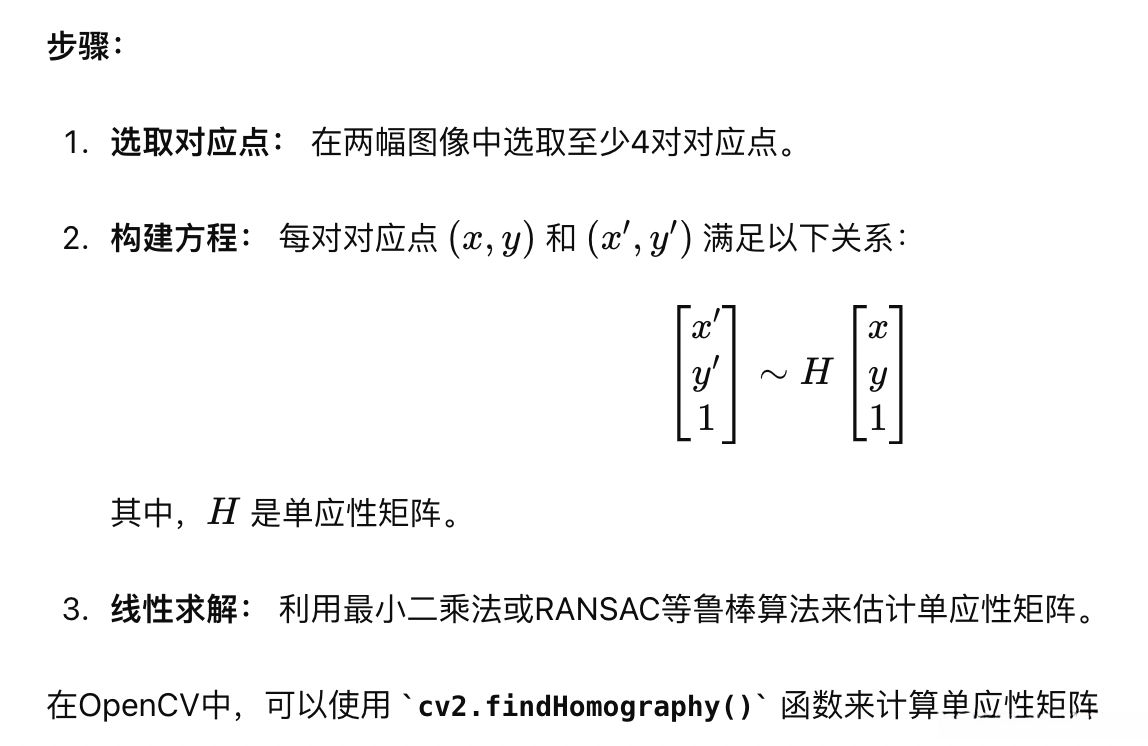 以下是一些估算单应性矩阵、基本几何约束关系矩阵以及物点之间相对位置与姿态关系模型的具体计算步骤。在实际操作中,这些步骤通常会涉及图像预处理、特征点提取与配准过程,并通过优化算法来提升计算效率和准确性。