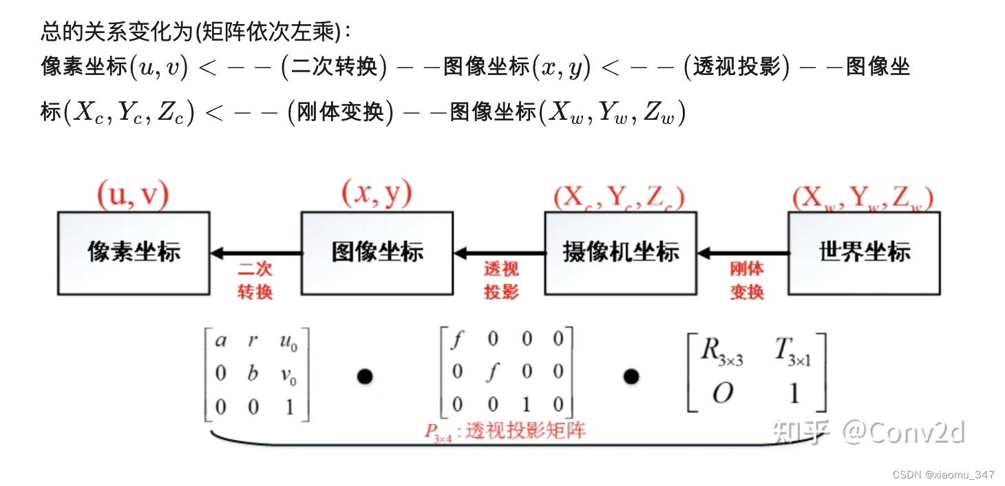 相机基于小孔成像原理,在实际应用中将真实的影像呈现在成像平面上。该平面作为物理世界中的真实存在,在尺寸上通常较小,并采用毫米作为基准单位。然而,在实际应用中所获取的图像则以像素为基准单位进行表示。因此,在图像处理领域中会区分并使用两种不同的坐标系统:一种是基于像素的图像坐标系(pixel-based coordinate system),另一种则是基于物理尺寸的实际空间坐标系(physical space coordinate system)。