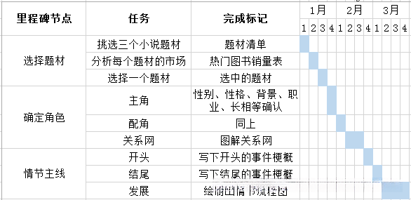 在为细分任务分配时间时,可以进一步考虑这些任务之间的先后顺序。比如联系出版社,有可能在确定情节主线之后就可以做了。