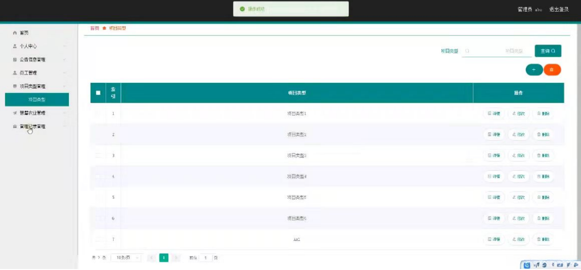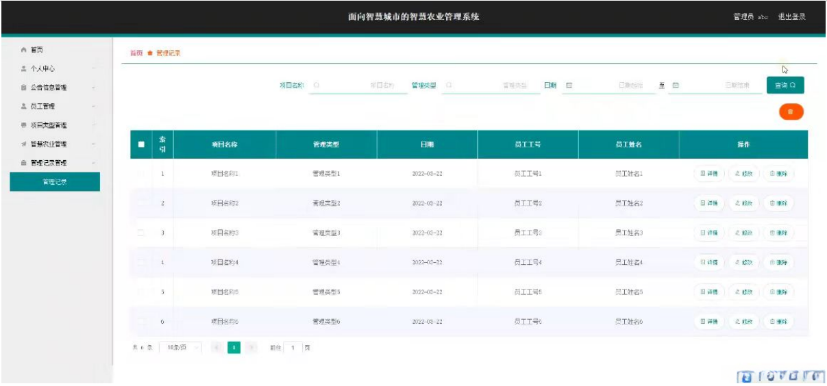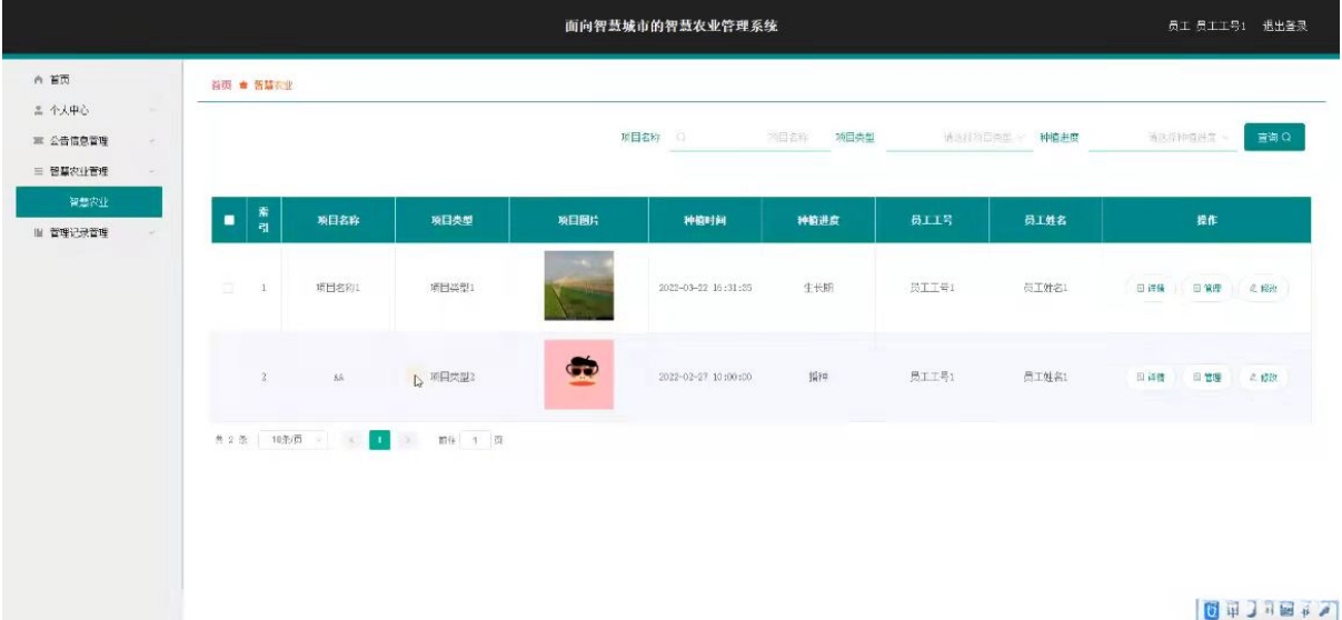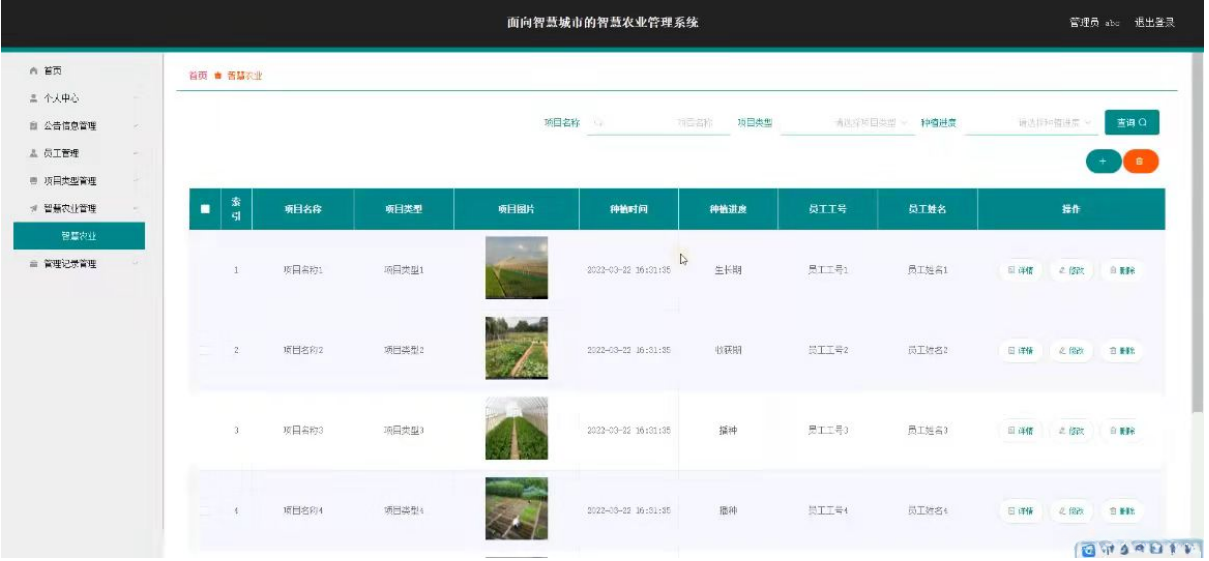 在该系统中,在智慧农业管理页面上可以实现信息查询、更新维护以及数据管理的具体操作包括:索引信息、项目名称、项目类型、图片资料、种植时间记录、进度追踪记录等,并支持删除操作;如图5-6所示