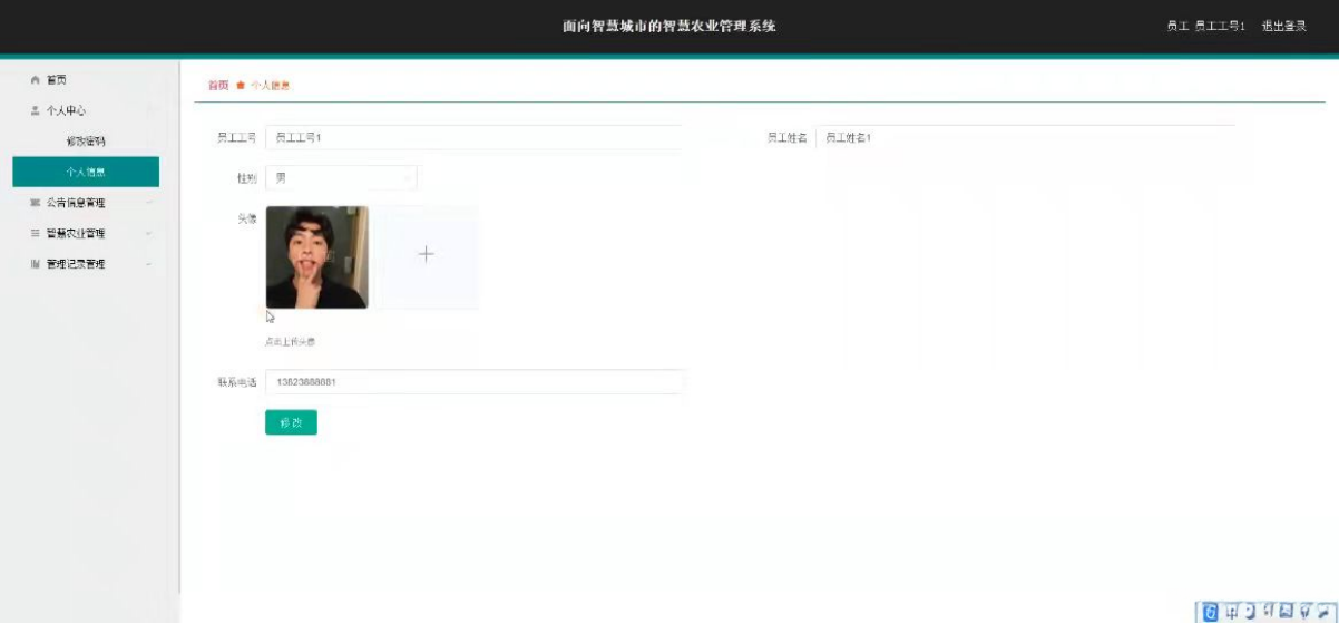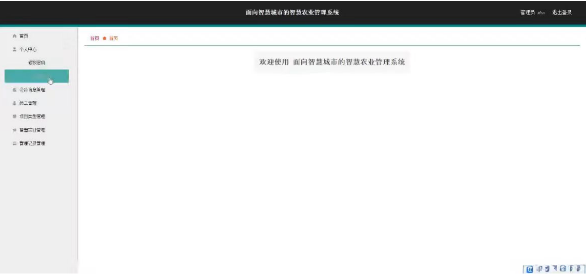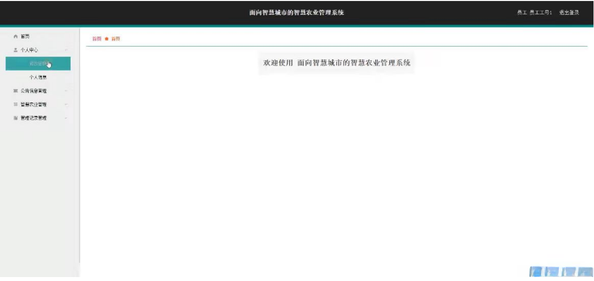 在员工登录系统中,默认状态下即可执行如下功能:首先是对首页内容的查看与编辑;其次是对个人中心信息的配置;再次是对公告信息的管理和更新;此外还有智慧农业相关的数据处理;最后是日常事务性的管理记录维护。如图5-9所示